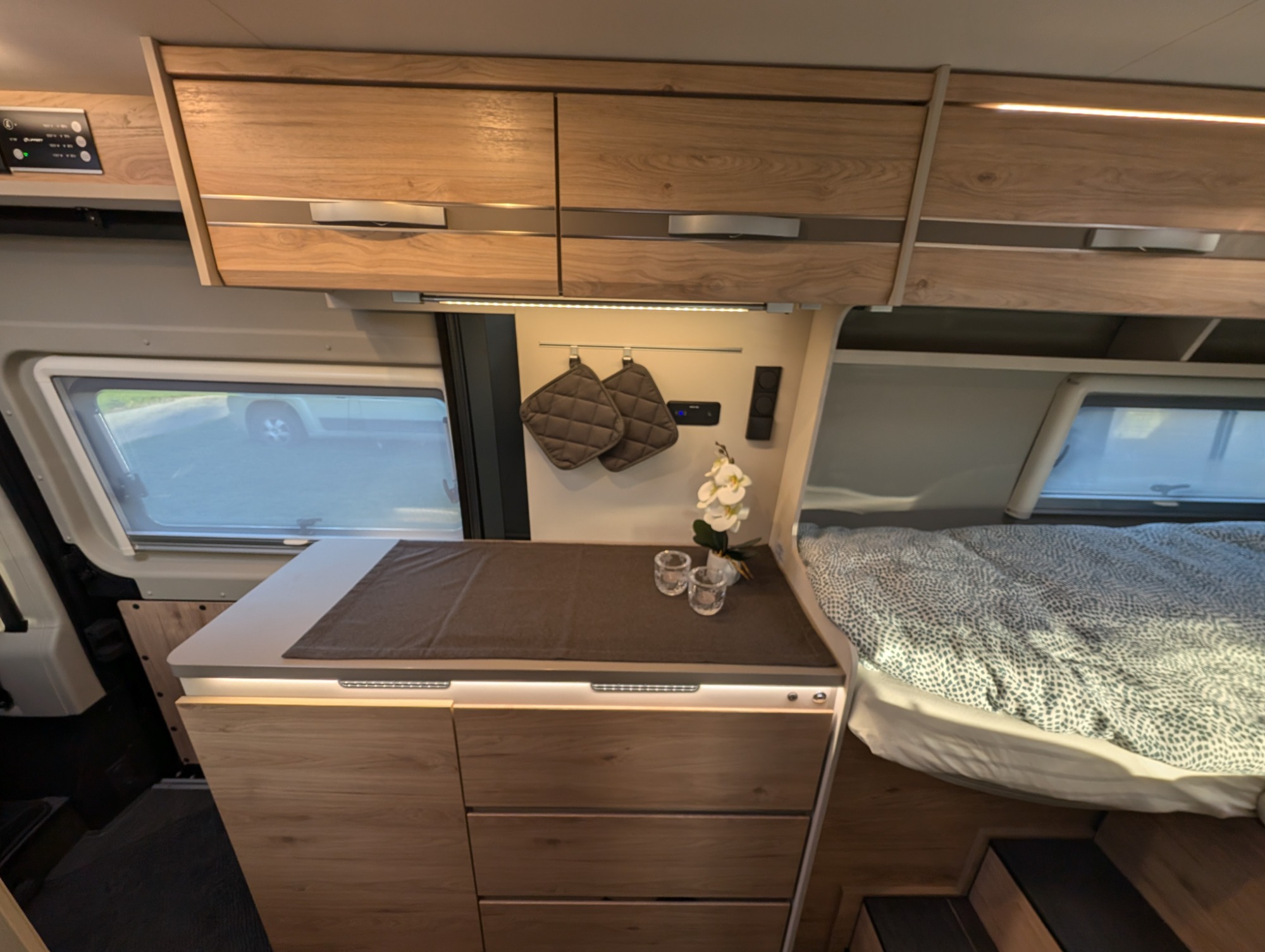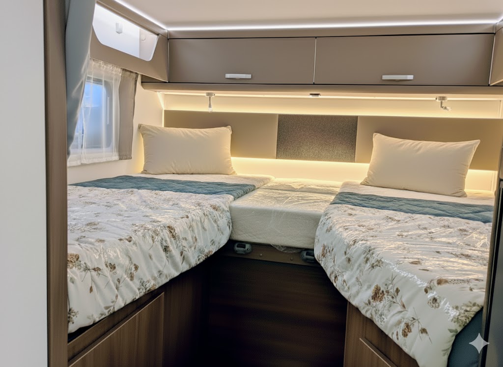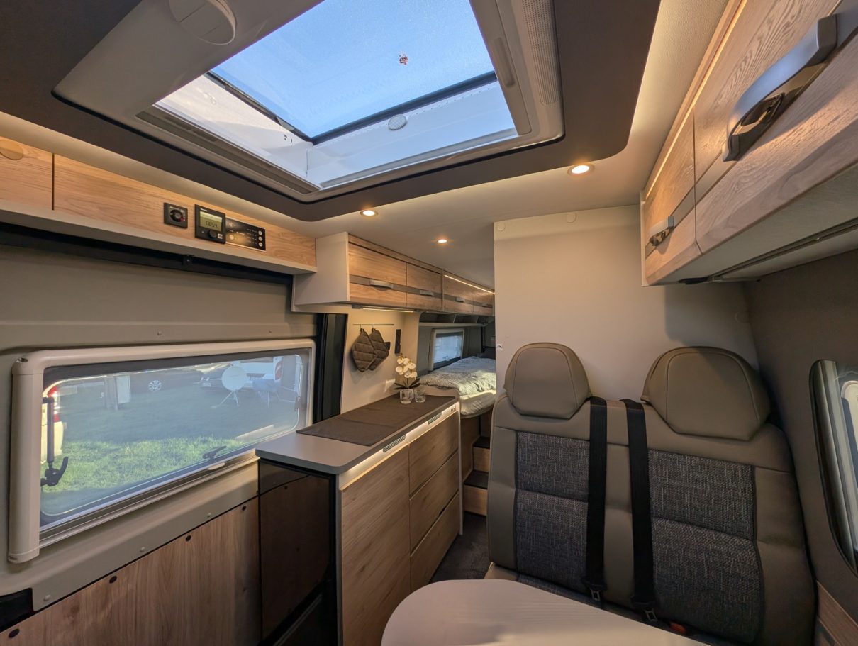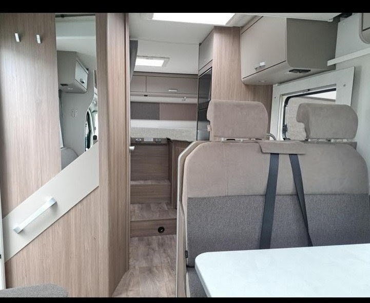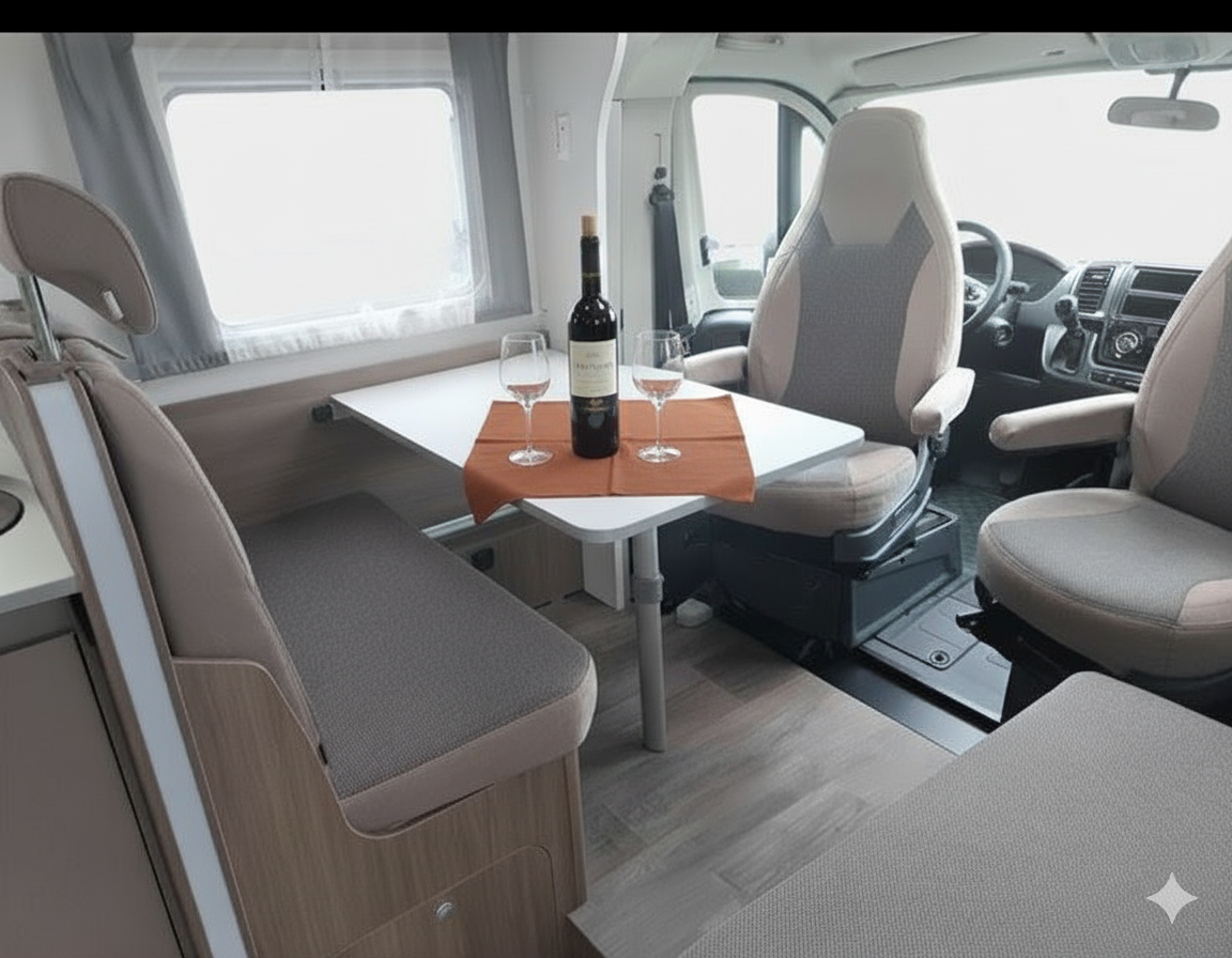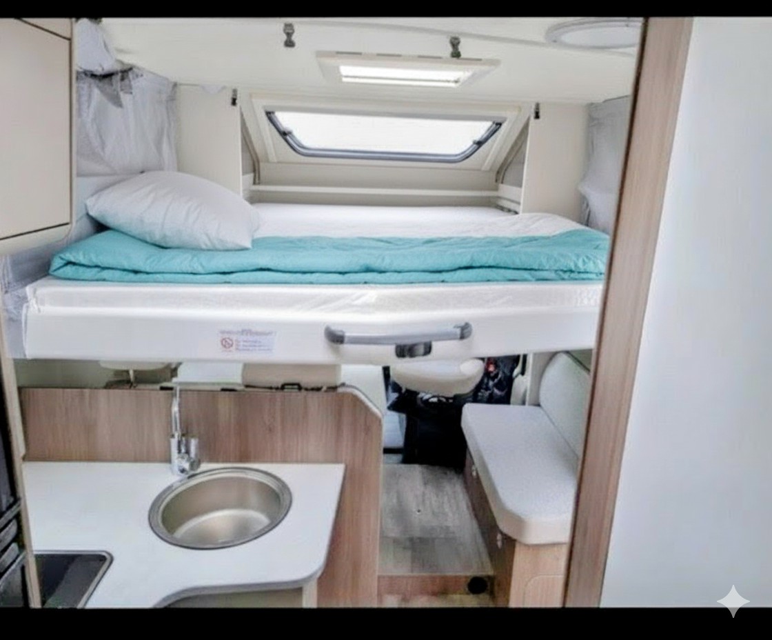 Unser Teilintegrierter Wohnmobil mit großen Einzelbetten und Hubbett bietet Ihnen ein großartiges Raumgefühl für unvergessliche Reisen. Ideal für Paare oder Familien, vereint er Komfort und Funktionalität. Genießen Sie die Freiheit, die Natur zu erkunden, während Sie in einem gemütlichen und stilvollen Ambiente wohnen. Die durchdachte Raumaufteilung sorgt dafür, dass Sie sich auch auf langen Fahrten wie zu Hause fühlen.