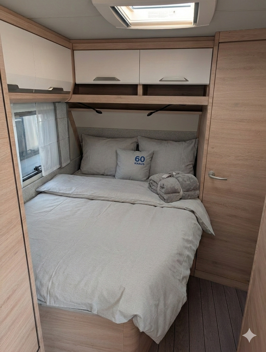„Gönnen Sie sich das Besondere: Unser brandneuer Knaus Südwind in der „60 Years“-Edition ist ein echtes Statement für Design-Liebhaber. Der Premium-Wohnwagen überzeugt nicht nur durch sein edles Interieur und das französische Bett mit Wellness-Matratze, sondern vor allem durch Sicherheit. Das integrierte ATC-Stabilitätssystem hält das Gespann auch in brenzligen Situationen sicher in der Spur. Ob zu zweit oder als kleine Familie – genießen Sie Vollausstattung inklusive Wasserfilter, Bluetooth-Sound und Ambientebeleuchtung für Ihren Traumurlaub 2026.“